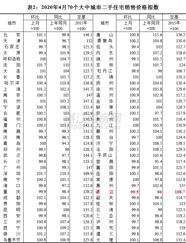 2020年4月份70個大中城市商品住宅銷售價格變動情況